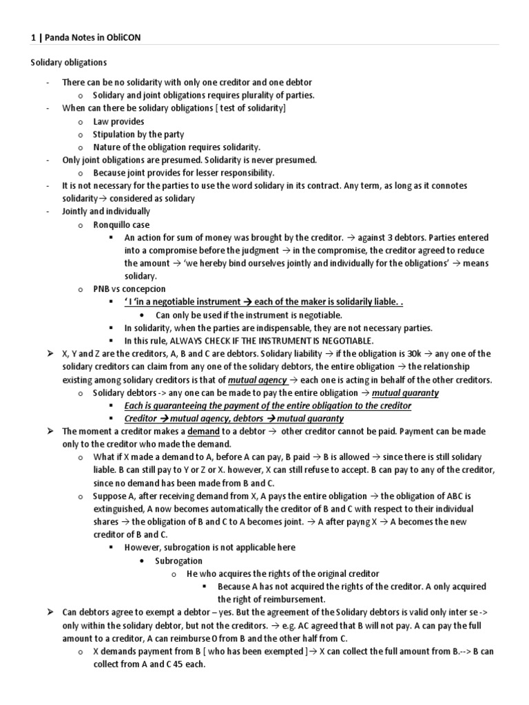 JOINT AND SOLIDARY OBLIGATIONS WORDS INDICATING A SOLIDARY ... from www.coursehero.com Solidary obligations paragraph (1) of the article defines solidary obligations, which are the plural obligations most frequently encountered in practice. In this section i articulate what i take to be the four jointly in reference to 7 solidarity: The obligation expressly so states, the law requires solidarity, the nature of the obligation requires solidarity. 1207) alternative facultative solidary debtors several prestations are due but only one prestation is due example: Kinds of solidary obligation 1. By way of example, people generally feel more strongly toward a motorist who runs another off the road because he is intoxicated as opposed to one who is simply inattentive. Compliance with one is although substitution is sufficient allowed one creditor, three debtors according to. In a solidary (or joint and several) obligation, a debtor can be held liable for the whole amount, and after that debtor pays the whole obligation, that same debtor can then proceed against his other debtors to be paid/reimbursed for the rest of the obligation.